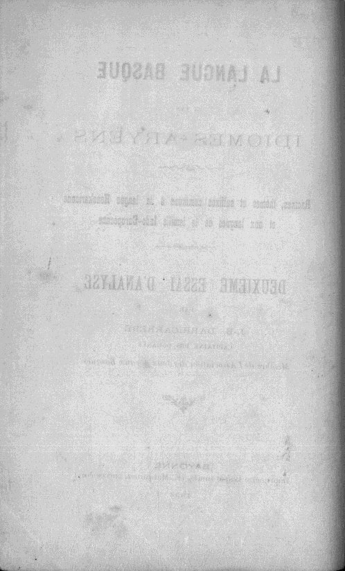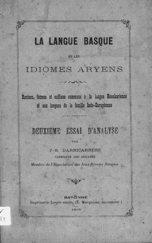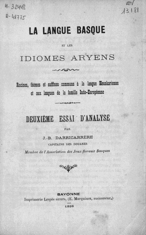 | Izenburua: | La Langue basque et les idiomes aryens : racines, thèmes et sufffxes [sic] communs à la langue heuskarienne et aux langues de la famille indo-européenne : deuxième essai d'analyse / par J.-B. Darricarrère. |