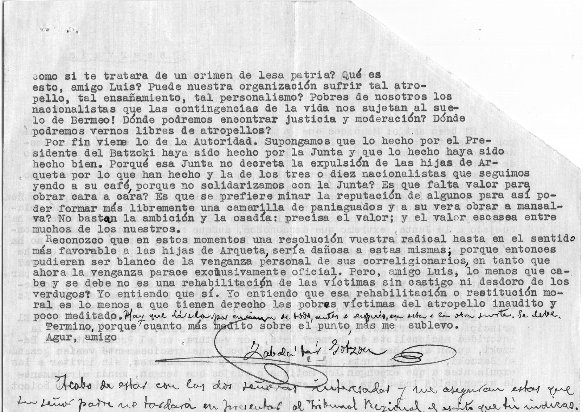| Título: | [Carta], 1932 ag. 26, a Arana-Goiri Koldobika, Bilbao'n [Manuscrito] / Zabala'tar Gotzon. |