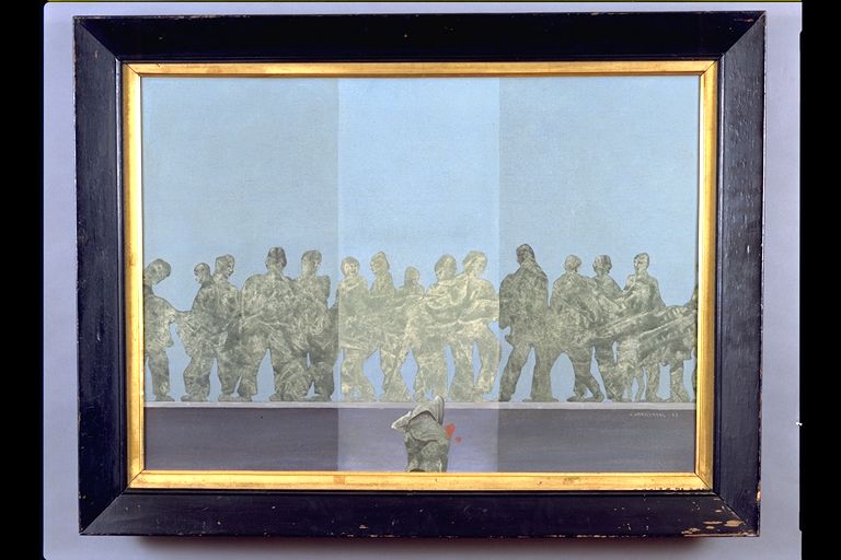 Composición de carácter social en la que aparecen una fila de figuras dispuesta en horizontal, sobre tintas planas. Sin entrar en el contenido social, observamos una atención interesante por la abstracción geométrica, es decir, el autor compone por medio de un juego entre simetrías y sección aurea, un cuadro de tonos planos sobre los cuales sitúa una fila de figuras tratadas dentro de una neofiguración basada en el perfil y la textura.