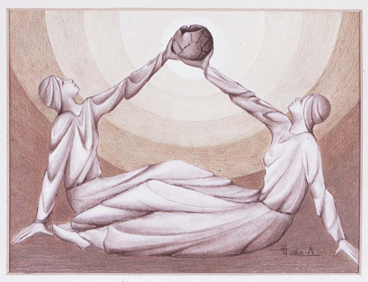 | Resumen: | Técnica: Sanguina Materia-soporte: Papel Dos figuras femeninas sentadas, una frente a la otra, sostienen una esfera resquebrajada. Firmado en ángulo inferior derecho. |
