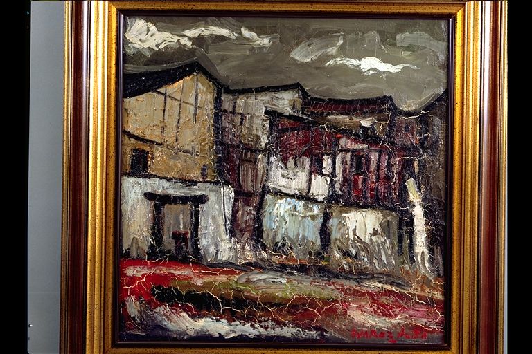 Paisaje rural con casas en segundo plano. Pintura pastosa en colores oscuro.