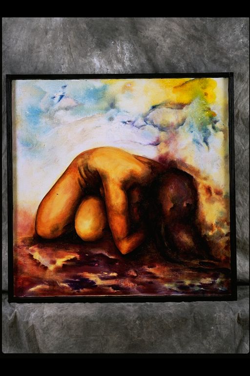 Mujer agachada, desnuda con el pelo suelto.