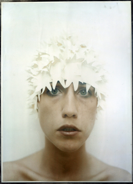 Cabeza de la autora tocada con un gorro blanco con adornos.