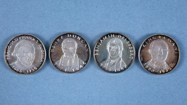 2 cajas con 4 medallas. Serie limitada de 2000 ejemplares. En el anverso efigies de: Francesco Piquer y Rudilla, Henri Duncan, Benjamin Delessert y Rama VI. En el reverso, edificios.