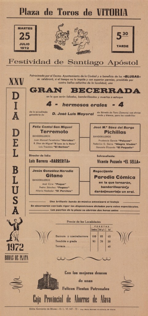 Title: Plaza de Toros de Vitoria [Material gráfico] : martes 25 julio... festividad de Santiago Apóstol... gran becerrada... : 4 -hermosos erales- 4 : Félix Centol San Miguel "Terremoto", José Ma. Sáez del Burgo "Pichillas", Jesús González Heredía "Gitano"